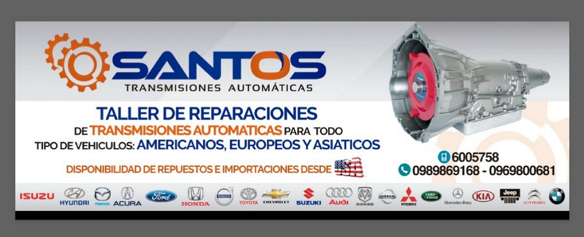 Santos Transmisiones Automáticas, es una empresa con muchos años de experiencia en asesoría, mantenimiento preventivo y reparaciones de cajas automáticas de todas las marcas a nivel mundial. Somos una empresa que estamos en constante capacitación, para así lograr la respuesta esperada de nuestros clientes, contamos con la tecnología apropiada para dar un diagnóstico correcto y pronta solución.